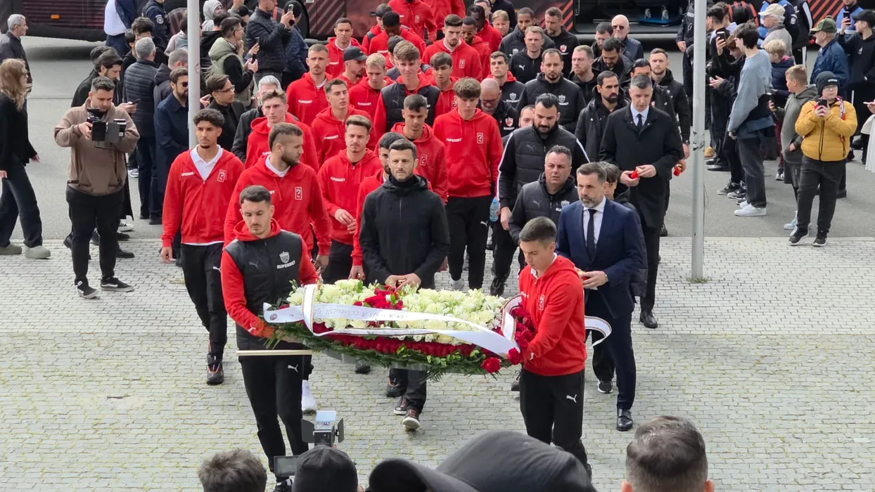 Fotbaliștii lui Dinamo au venit să îi aducă un omagiu lui Mircea Lucescu. Au cărat cu greu coroana imensă din partea clubului