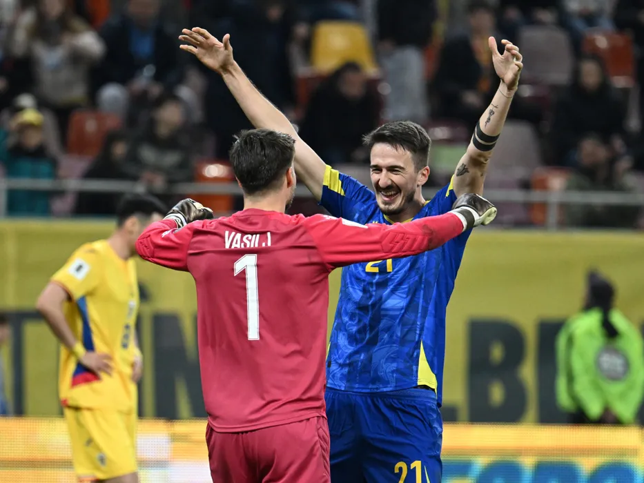 Fotbalistii bosniaci Nikola Vasilj si Stjepan Radeljić se bucura dupa meciul de fotbal dintre Romania si Bosnia Hertegovina, din cadrul Preliminariilor Campionatului Mondial 2026, desfasurat pe Arena Nationala din Bucuresti, vineri 21 martie 2025. © FOTO:Razvan Pasarica/SPORT PICTURES