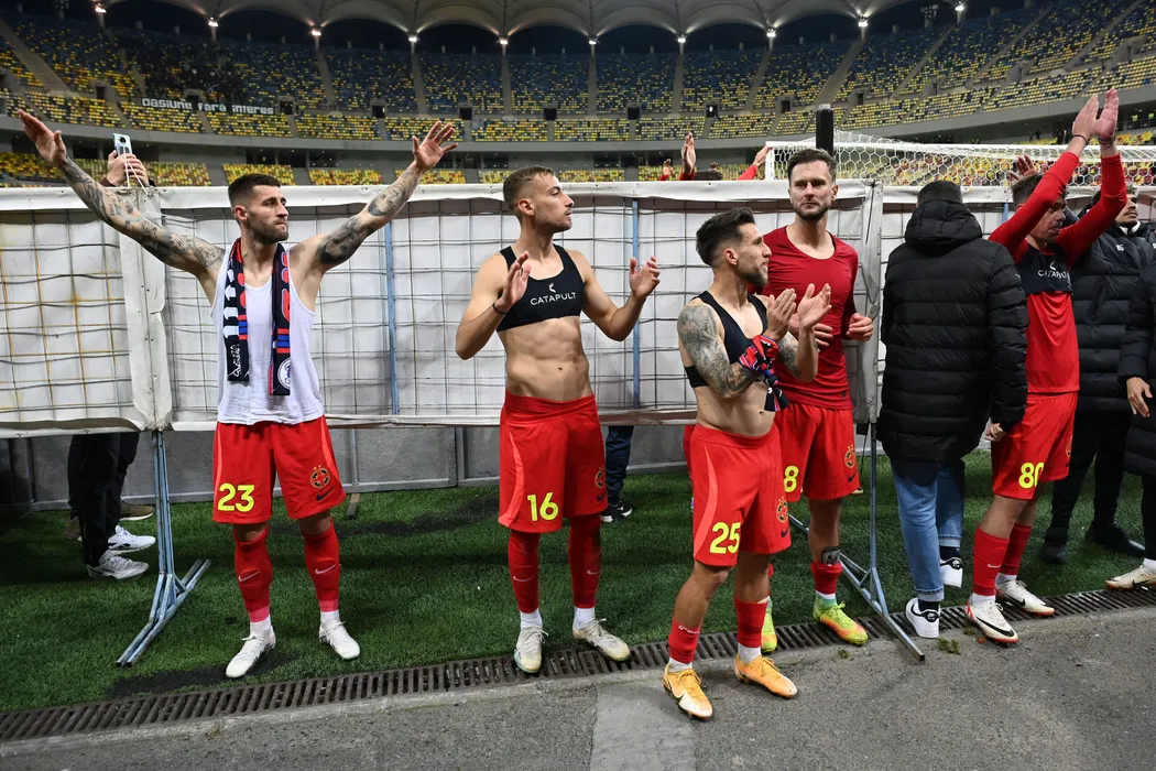 Fotbalistii stelisti Ovidiu Marian Popescu, Alexandru Mihail Baluta si Damjan Djokovic saluta galeria dupa meciul de fotbal dintre FCSB si FC U Craiova, din cadrul Superligii Superbet, desfasurat pe Arena Nationala din Bucuresti, duminica 12 noiembrie 2023. © FOTO:Razvan Pasarica/SPORT PICTURES