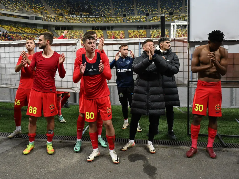 Fotbalistii stelisti Mihai Daniel Lixandru, Damjan Djokovic,Eduard Gabriel Radaslavescu, Florinel Teodor Coman si Siyabonga Ngezana saluta galeria dupa meciul de fotbal dintre FCSB si FC U Craiova, din cadrul Superligii Superbet, desfasurat pe Arena Nationala din Bucuresti, duminica 12 noiembrie 2023. © FOTO:Razvan Pasarica/SPORT PICTURES