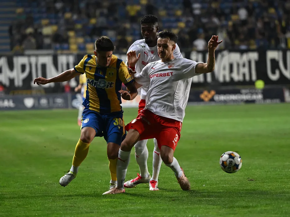 Ioan Catalin Tolea, Kennedy Kofi Boateng si Raul Marian Oprut in meciul dintre Petrolul Ploiesti si Dinamo Bucuresti, contand pentru Superliga Superbet, desfasurat pe Stadionul Ilie Oana din Ploiesti, luni 15 septembrie 2025. © FOTO:Razvan Pasarica/SPORT PICTURES