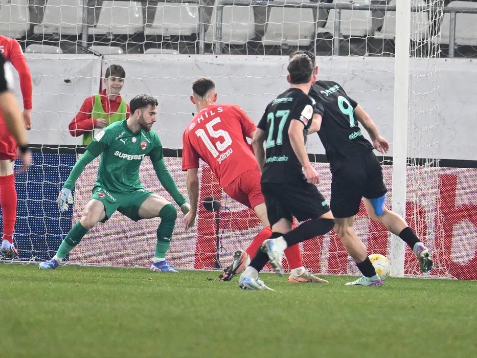 Valentin Dumitrache suteaza in bara portii aparate de catre Alexandru Vasile Rosca Ailisei in meciul de fotbal dintre Dinamo Bucuresti si Metalul Buzau, contand pentru Cupa Romaniei Betano, desfasurat pe Stadionul Arcul de Triumf din Bucuresti, joi 5 martie 2026. © FOTO:Razvan Pasarica/SPORT PICTURES