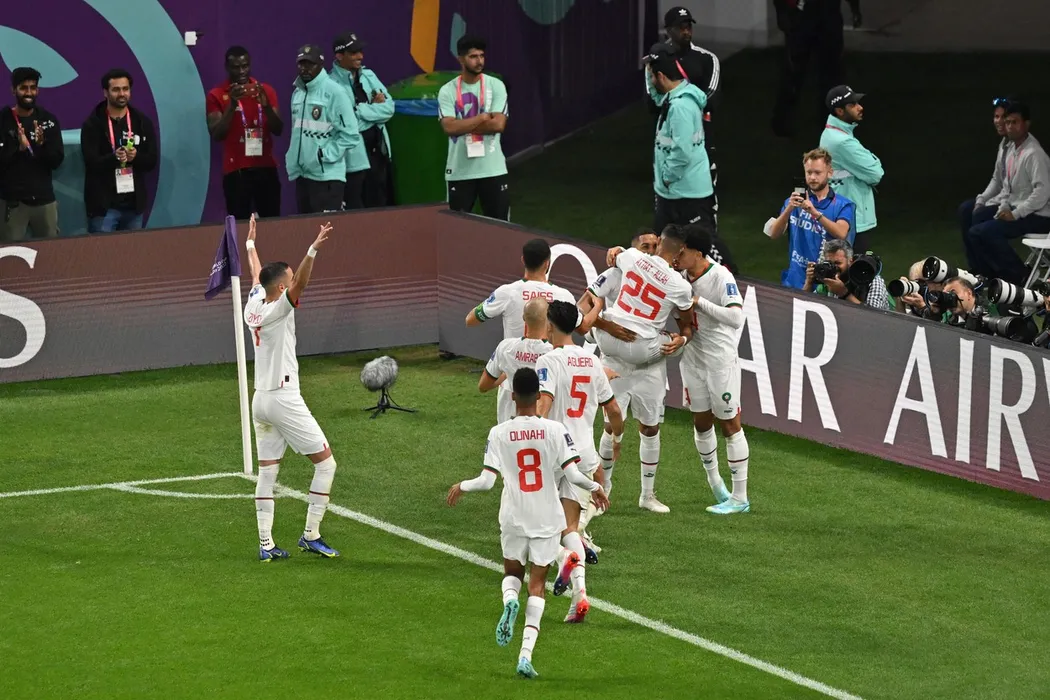Morocco's midfielder #11 Abdelhamid Sabiri (back) celebrates teammates after he scored his team's first goal during the Qatar 2022 World Cup Group F football match between Belgium and Morocco at the Al-Thumama Stadium in Doha on November 27, 2022.,Image: 740505833, License: Rights-managed, Restrictions: , Model Release: no