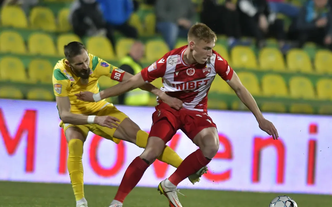 Gheorghe Bogdan Rusu si Balthazar Jean Phillipe Marie Pierret in meciul de fotbal dintre CS Mioveni si Dinamo Bucuresti, contand pentru Play-out-ul Ligii 1 Casa Pariurilor, desfasurat pe Stadionul Orasenesc din Mioveni, vineri 15 aprilie 2022. © FOTO:Razvan Pasarica/SPORT PICTURES