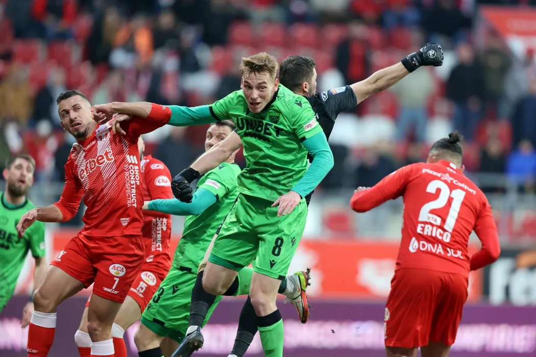 Roger Junio Rodriguez (S), de la UTA Arad, lupta pentru balon cu Balthazar Pierret (D), de la Dinamo, in meciul de fotbal din etapa a XXVI-a a Ligii 1, disputat pe Arena Francisc Neuman din Arad, duminica, 13 februarie 2022. CIPRIAN PETCUT / MEDIAFAX FOTO