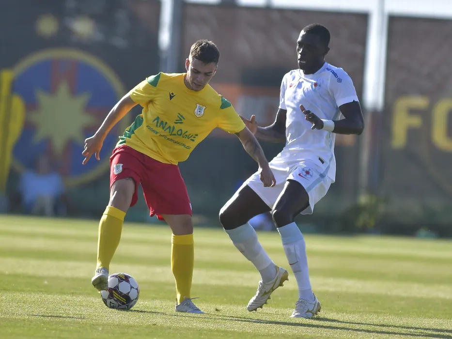 Cristian Dumitru si Joyskim Dawa in meciul amical de fotbal dintre FCSB si CS Mioveni, desfasurat la Baza FCSB din Berceni, miercuri 6 iulie 2022. © FOTO:Razvan Pasarica/SPORT PICTURES
