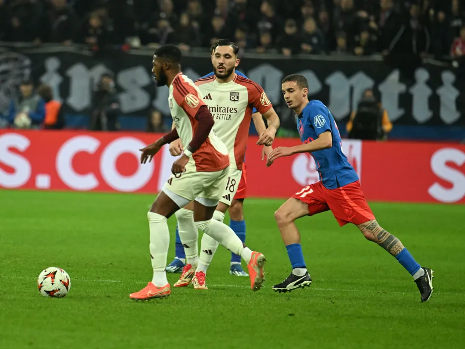 Rayan Cherki si Juri Cisotti in meciul de fotbal dintre FCSB si Olympique Lyon, din cadrul UEFA Europa League, desfasurat pe Arena Nationala din Bucuresti, joi 6 martie 2025. © FOTO:Razvan Pasarica/SPORT PICTURES