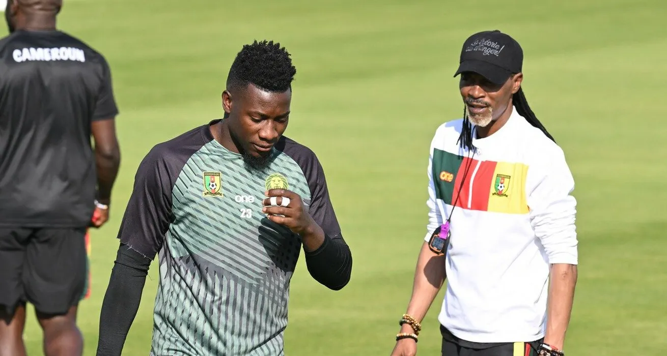 Cameroon's head coach Rigobert Song (R) oversee a training session of his players including Cameroon's goalkeeper Andre Onana on November 27, 2022 at the Al Sailiya SC in Doha on the eve of a Qatar 2022 World Cup football match between Cameroon and Serbia.,Image: 740499959, License: Rights-managed, Restrictions: , Model Release: no