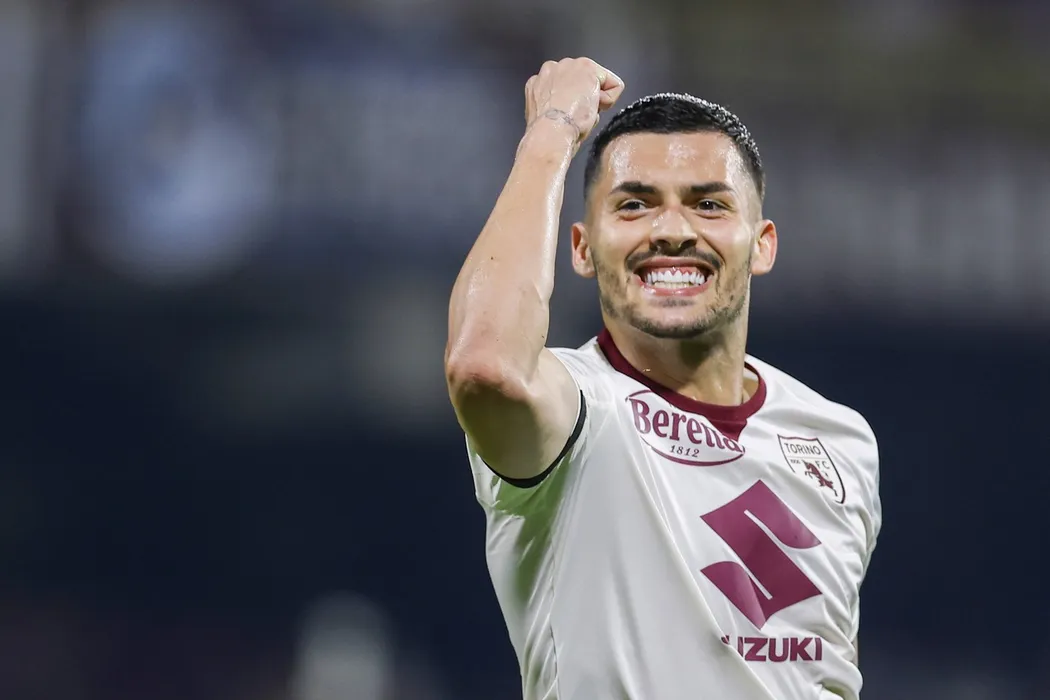 Torino s Serbian midfielder Nemanja Radonjic celebrates after scoring a goal during the Serie A football match between Unione Sportiva Salernitana vs Torino Football Club at the Arechi Stadium in Salerno on September 18, 2023. Copyright: xAntonioxBalasco/IPAxSportx/xipa-x/xx IPA_40395467 IPA_IPA40395467,Image: 834115917, License: Rights-managed, Restrictions: PUBLICATIONxNOTxINxITA, Credit images as "Profimedia/ IMAGO", Model Release: no