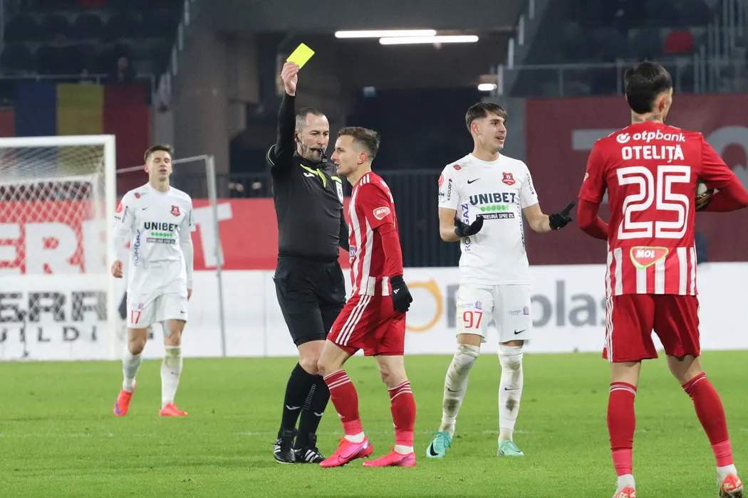 Arbitrul central Ionuț Coza arată cartonașul galben lui Marius Ștefănescu în meciul de fotbal dintre AFC Hermannstadt Sibiu si ACS Sepsi OSK Sfântu Gheorghe, contând pentru Superliga Superbet, desfășurat pe Stadionul Municipal din Sibiu, joi 21 decembrie 2023. © FOTO: Valentin MACREA/SPORT PICTURES