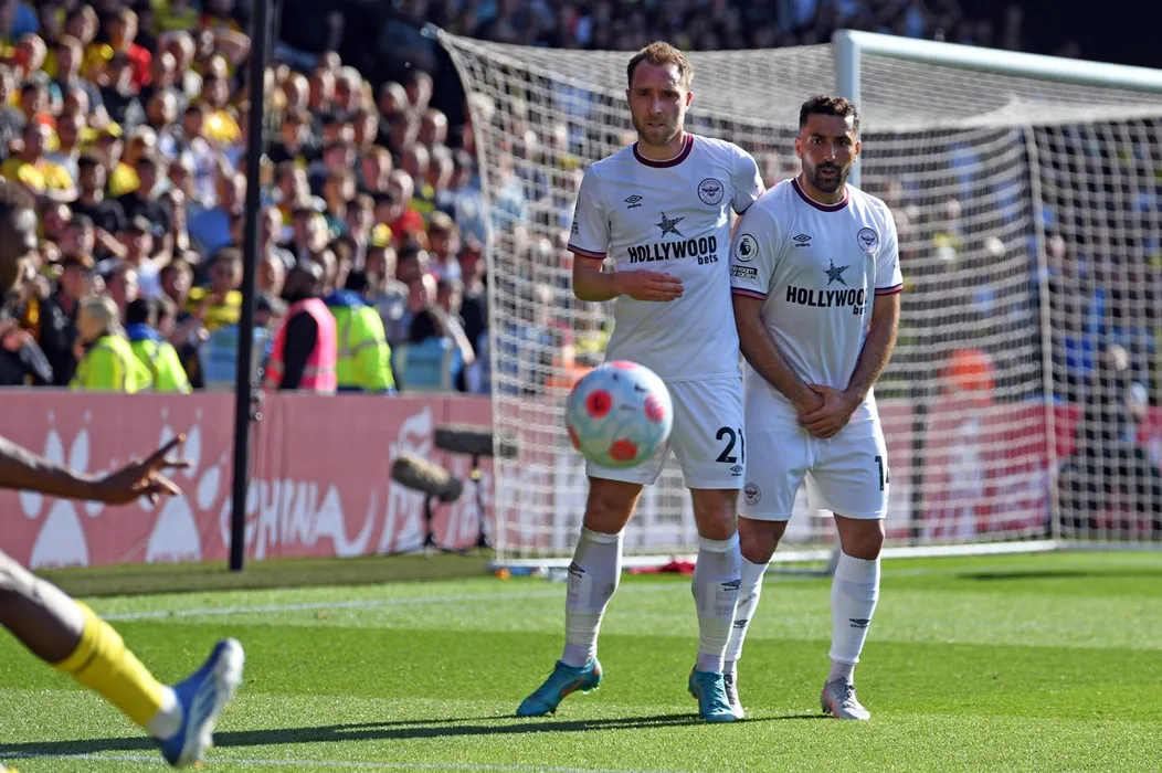Brentford midfielder Christian Eriksen (21) and Brentford forward Saman Ghoddos (14) defending during the Premier League match between Watford and Brentford at Vicarage Road, Watford