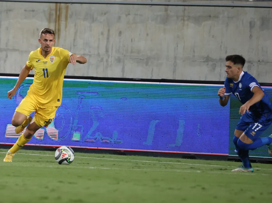 Nicușor Bancu și Loizos Loizou în meciul de fotbal dintre Cipru și România, contând pentru Liga Națiunilor, desfășurat pe Stadionul AEK Arena din Larnaca, sâmbătă 12 octombrie 2024. © FOTO: SPORT PICTURES