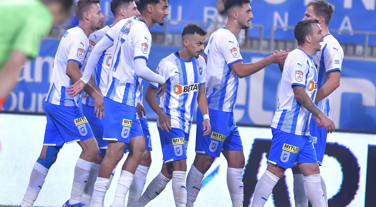 Bucurie a fotbalistilor craioveni dupa un gol marcat cu Nicusor Silviu Bancu, Alexandru George Cimpanu, Lyes Hafid Houri, Andrei Virgil Ivan si Mihai Alexandru Balasa in meciul de fotbal dintre Universitatea Craiova si Academica Clinceni, contand pentru Liga 1 Casa Pariurilor, desfasurat pe Stadionul Ion Oblemenco din Craiova, luni 18 octombrie 2021. © FOTO:Razvan Pasarica/SPORT PICTURES