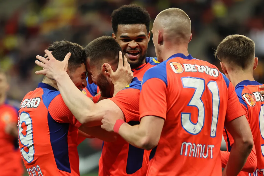 Jucatorii formatiei FCSB reactioneaza dupa inscrierea unui gol in timpul meciului de fotbal contra echipei FC Voluntari din etapa a 4-a a play-off-ului Ligii 1, disputat pe Arena Nationala din Bucuresti, luni, 11 aprilie 2022. GEORGE FILIP / MEDIAFAX FOTO