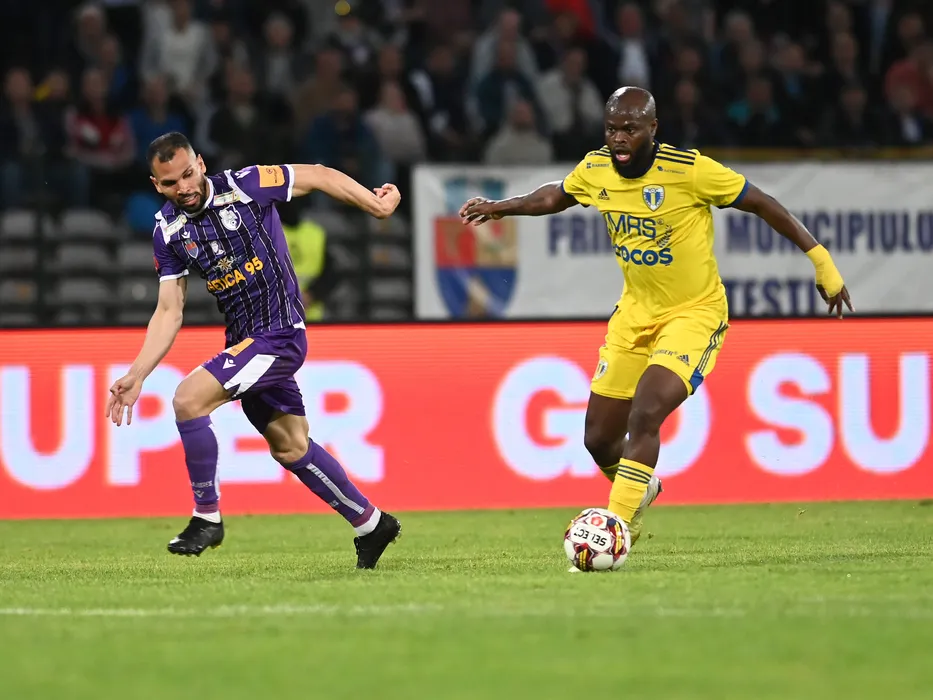 Cesar Daniel Meza Colli si Tiemoko Ismael Diomande in meciul de fotbal dintre FC Arges si Petrolul Ploiesti, contand pentru Play-out-ul Superligii Superbet, desfasurat pe Stadionul Nicolae Dobrin din Pitesti, vineri 19 mai 2023. © FOTO:Razvan Pasarica/SPORT PICTURES