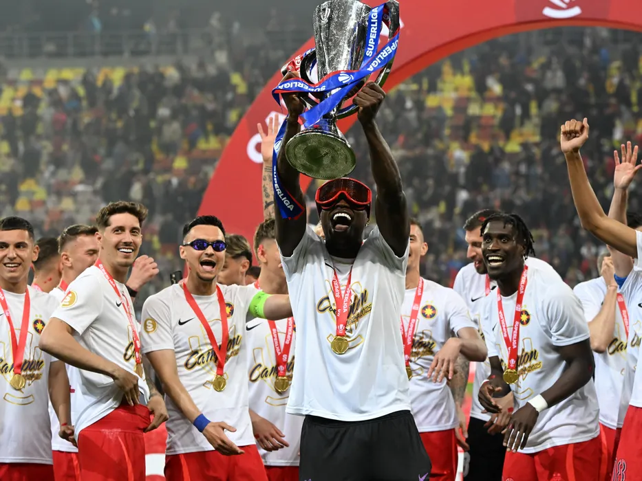 Fotbalistii ros-albastrii celebreaza alături de Joyskim Aurelien Dawa Tchakonte castigarea Superligii Superbet in urma meciului dintre FCSB si Universitatea Craiova, din cadrul Play off-ului competitiei, desfasurat pe Arena Nationala din Bucuresti, sambata 17 mai 2025. © FOTO:Razvan Pasarica/SPORT PICTURES