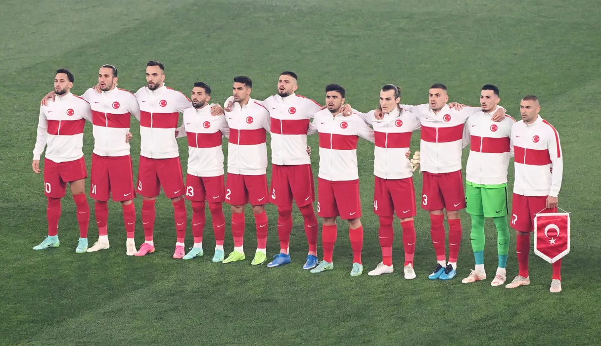 11 June 2021, Italy, Rome: Turkey [players (L-R) Hakan Calhanoglu, Yusuf Yazici, Kenan Karaman, Cengiz Umut Meras, Mehmet Zeki Celik, Okay Yokuslu, Ozan Tufan, Caglar Soyuncu, Merih Demiral, goalkeeper Ugurcan Cakir and Burak Yilmaz, sing the national anthem before the start of the UEFA EURO 2020 Group A soccer match between Italy and Turkey at the Olympic Stadium. Photo: Matthias Balk/dpa