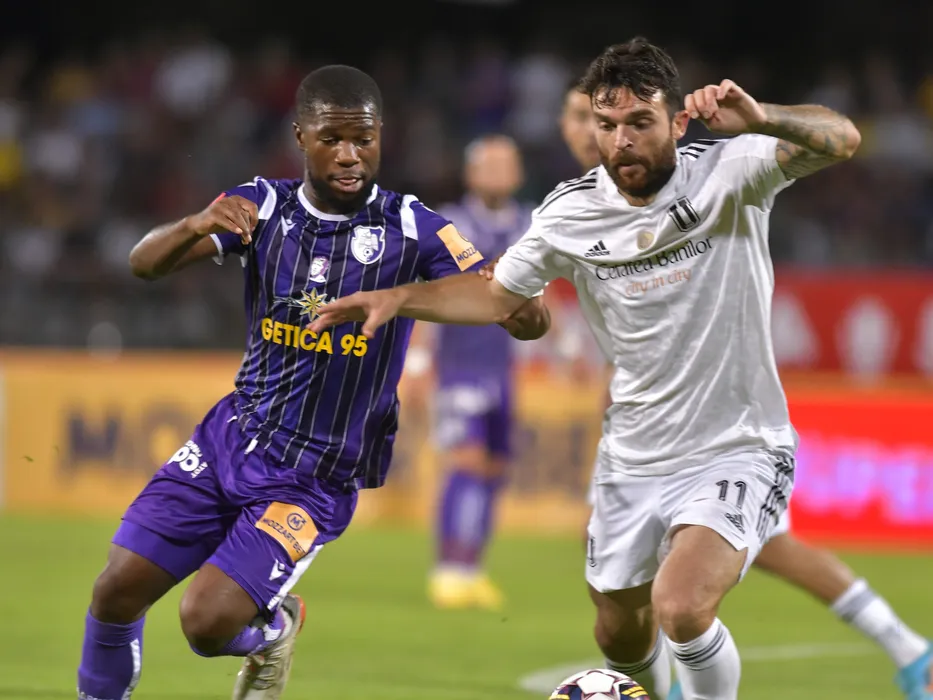 Tony Wilfried Nyandjou Njike si Aurelian Ionut Chitu in meciul de fotbal dintre FC Arges si FC U Craiova, contand pentru Superliga Superbet, desfasurat pe Stadionul Nicolae Dobrin din Pitesti, sambata 12 august 2022. © FOTO:Razvan Pasarica/SPORT PICTURES