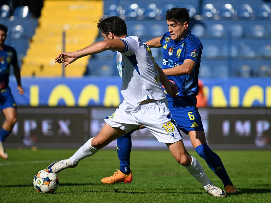 Konstantinos Doumtsios si Marius Paul Antoche in meciul dintre Unirea Slobozia si Petrolul Ploiesti, contand pentru Superliga Superbet, desfasurat pe Clinceni Arena din Clinceni, duminica 21 septembrie 2025. © FOTO:Razvan Pasarica/SPORT PICTURES