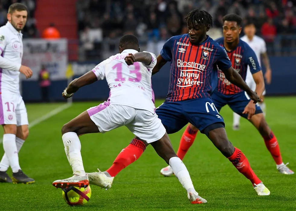Caen's Congolese forward Herman Moussaki (R) vies with Reims' French midfielder Hassane Kamara during the French L1 football match between Caen and Reims at the Michel d'Ornano Stadium in Caen, western France, on May 11, 2019.,Image: 432542426, License: Rights-managed, Restrictions: , Model Release: no