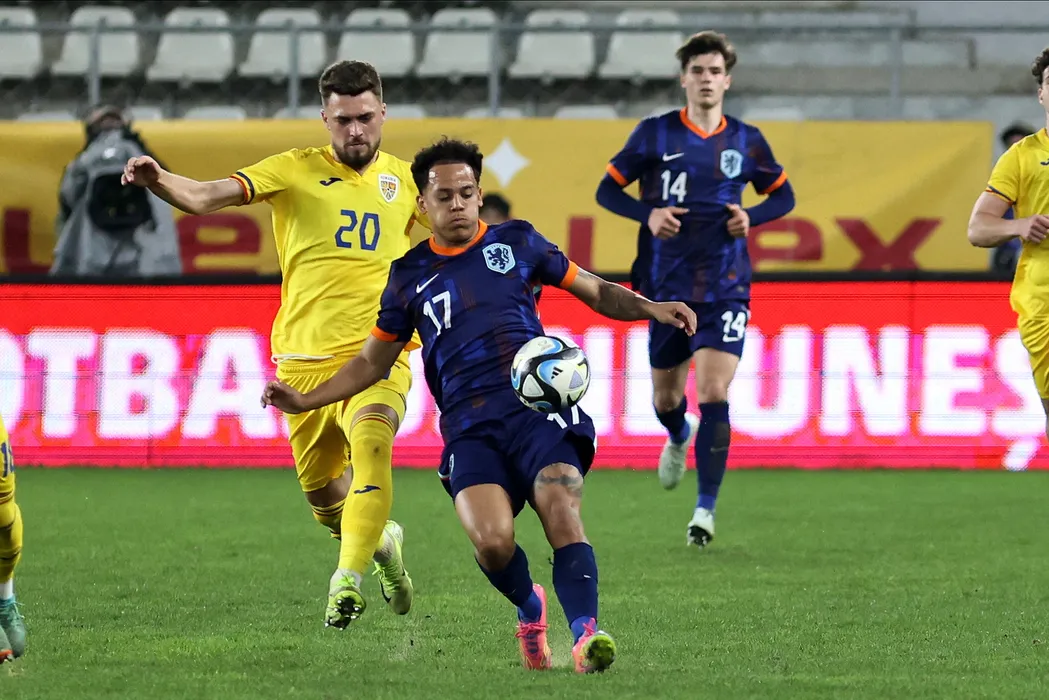 Ovidiu Perianu (S), de la Romania U21, lupta pentru balon cu Milion Manhoef (D), de la Tarile de Jos U21, in meciul de fotbal disputat pe Complexul Sportiv National „Arcul de Triumf”, marti, 25 martie 2025. GEORGE FILIP / MEDIAFAX FOTO
