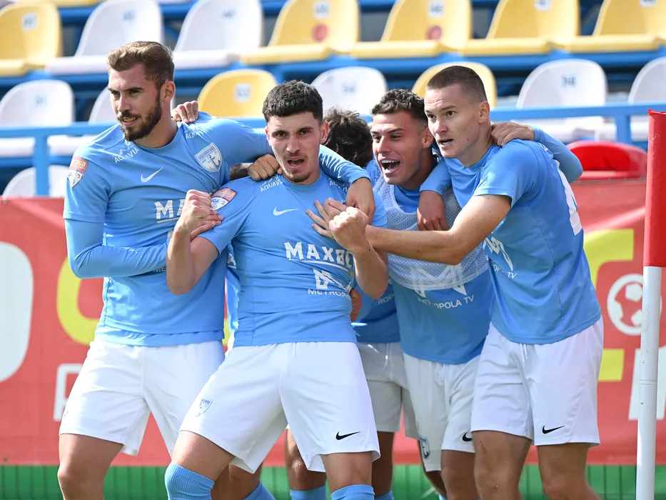 Fotbalistii voluntareni Andrei Vladut Pandele, Remus Gabriel Gutea, Daniel Marian Toma si Mihael Alexandu Onisa se bucura dupa un gol marcat in meciul de fotbal dintre FC Voluntari si CSM Resita, contand pentru Liga a-2-a Casa Pariurilor, desfasurat pe Stadionul Anghel Iordanescu din Voluntari, sambata 27 septembrie 2025. © FOTO:Razvan Pasarica/SPORT PICTURES