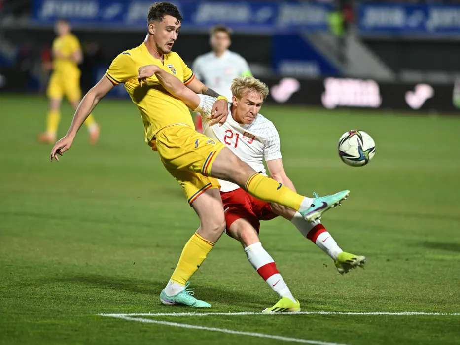 Ștefan Duțu si Aleksander Buksa in meciul de fotbal dintre Romania U20 si Polonia U20, contand pentru Elite League, desfasurat pe Stadionul Eugen Popescu din Targoviste, marti 26 martie 2024. © FOTO:Razvan Pasarica/SPORT PICTURES