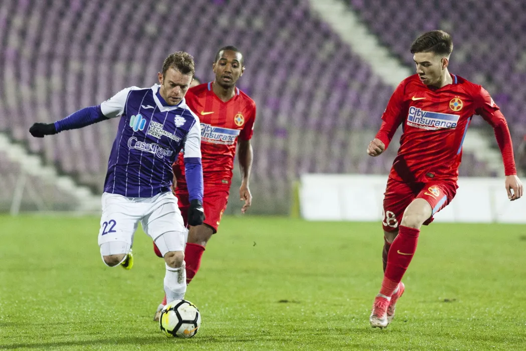 Alexandru Munteanu si Mario Mihai in meciul de fotbal dintre ACS Poli Timisoara si FCSB din optimile Cupei Romaniei, disputat pe stadionul Dan Paltinisanu din Timisoara, joi, 30 noiembrie 2017. © FOTO: Cornel Putan / Sport Pictures