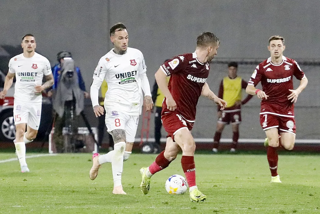 Alesssandro Murgia, Goncalves Tiago Lisboa Silva si Phillipe Razvan Onea, Claudiu Valentin Micovschi in meciul de fotbal dintre AFC Hermannstadt Sibiu si FC Rapid 1923 Bucuresti, contand pentru semifinala Cupei Romaniei Betano, desfasurat pe Stadionul Municipal din Sibiu, miercuri 23 aprilie 2025. © FOTO: Valentin Macrea/SPORT PICTURES