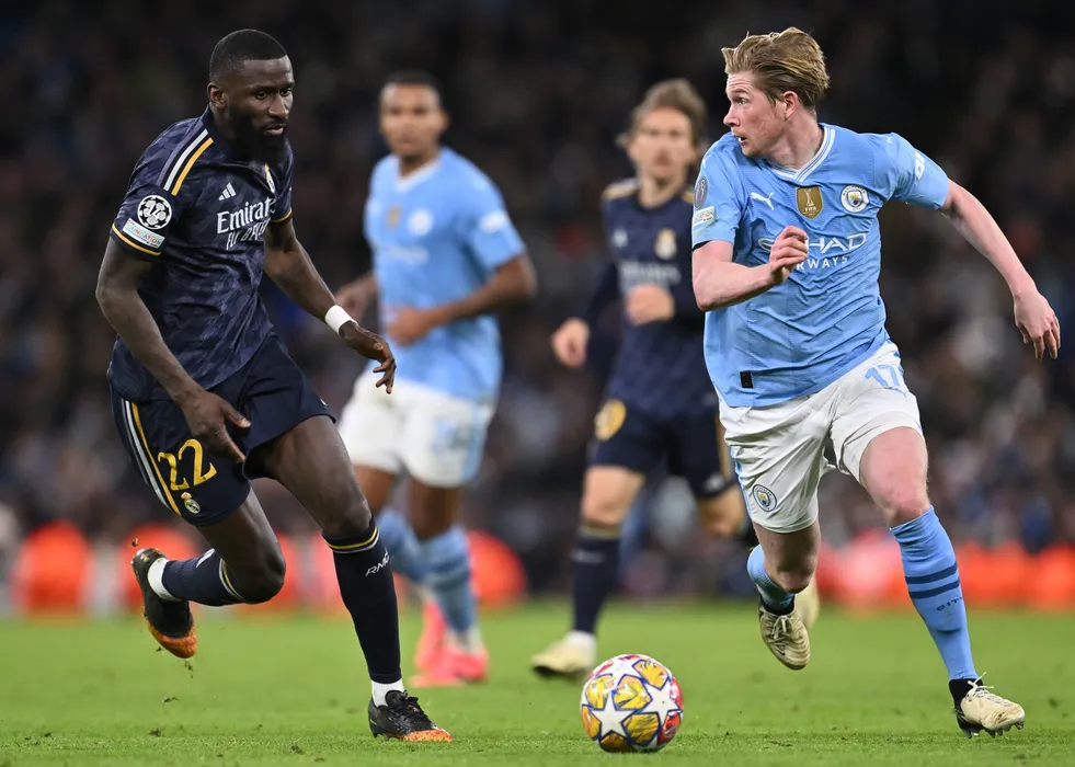 Kevin De Bruyne of Manchester City battles for possession with Antonio Rüdiger of Real Madrid during the UEFA Champions League semi final return leg football match between Manchester City and Real Madrid at the Etihad Stadium in Manchester England (Will Palmer/SPP),Image: 865734195, License: Rights-managed, Restrictions: *** World Rights Except Brazil and Mexico *** BRAOUT MEXOUT, Model Release: no