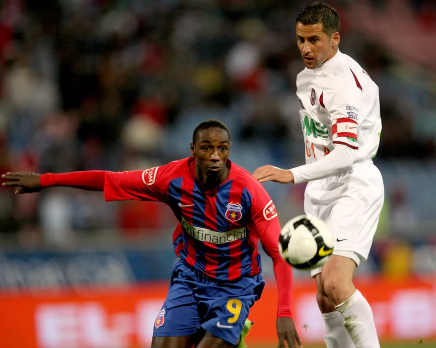Semedo Antonio (S), de la Steaua Bucuresti, se lupta pentru balon cu Cristian Panin (D), de la CFR Cluj, in meciul din etapa a XXVI-a a Ligii I, disputat in Bucuresti, miercuri, 22 aprilie 2009. CONSTANTIN VLADESCU / MEDIAFAX FOTO