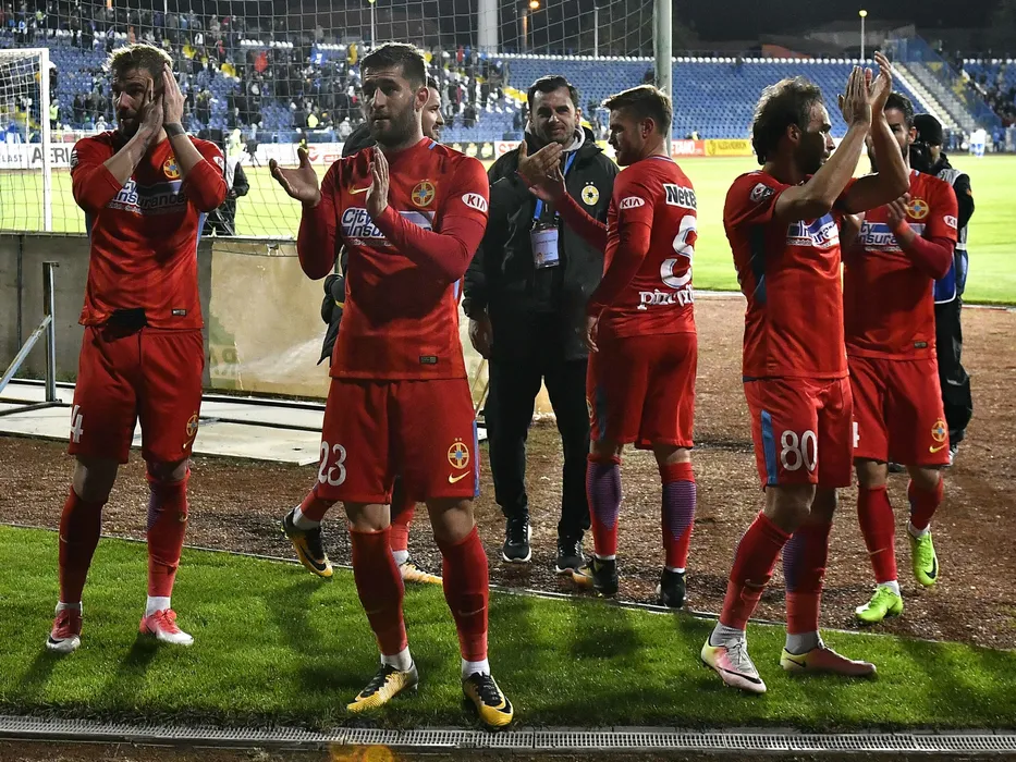 Bucurie stelista cu Mihai Balasa,Ovidiu Popescu,Nicolae Dica,Mihai Pintilii si Filipe Teixeira dupa meciul de fotbal dintre CS Universitatea Craiova si FC Steaua Bucuresti din cadrul Ligii 1 Betano, desfasurat pe stadionul Municipal din Drobeta Turnu Severin, duminica 29 octombrie 2017. © FOTO: Razvan Pasarica/SPORT PICTURES