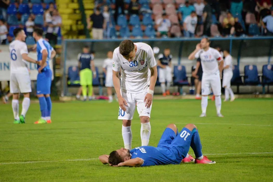 Nicolae Musat il ajuta sa se ridice pe Dan Firtulescu in timpul meciului dintre FC Botosani si Pandurii Targu Jiu din ultima etapa a play out-ului Ligii 1 Orange, disputat pe stadionul Municipal din Botosani duminica, 4 iunie 2017. IONUT TABULTOC / SPORT PICTURES