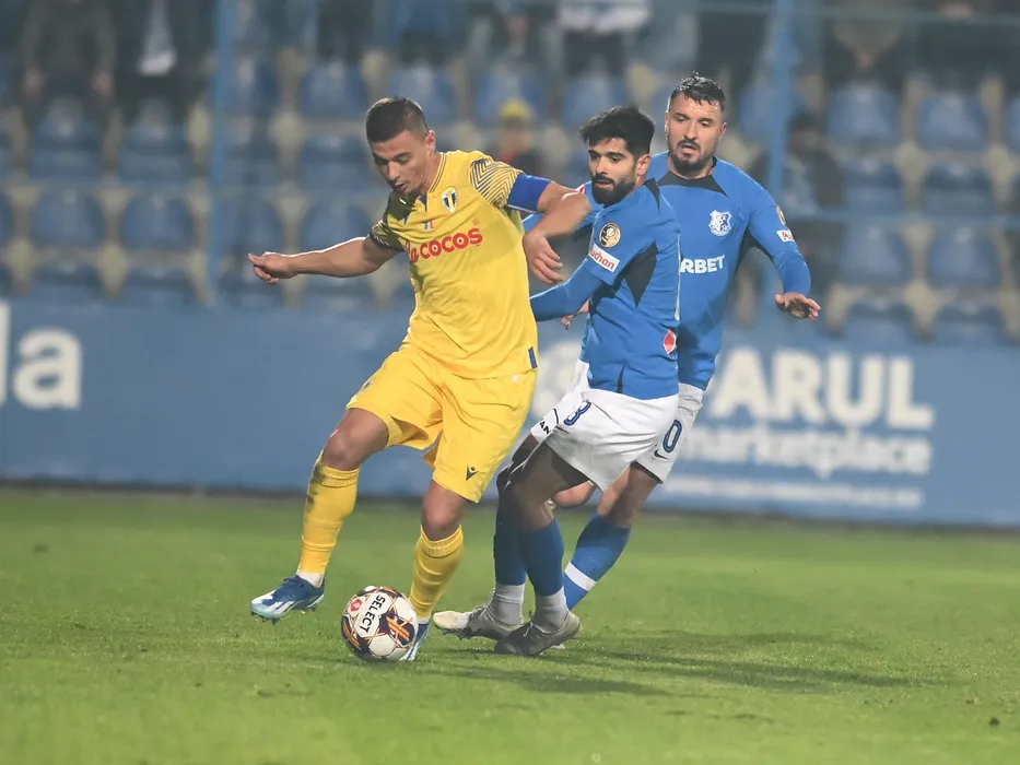 Valentin Constantin Ticu, Ionut Daniel Vina si Constantin Valentin Budescu in meciul de fotbal dintre Farul Constanta si Petrolul Ploiesti, contand pentru Superliga Superbet, desfasurat pe Stadionul central al Academiei Gheorghe Hagi din Ovidiu, duminica 10 decembrie 2023. © FOTO:Razvan Pasarica/SPORT PICTURES