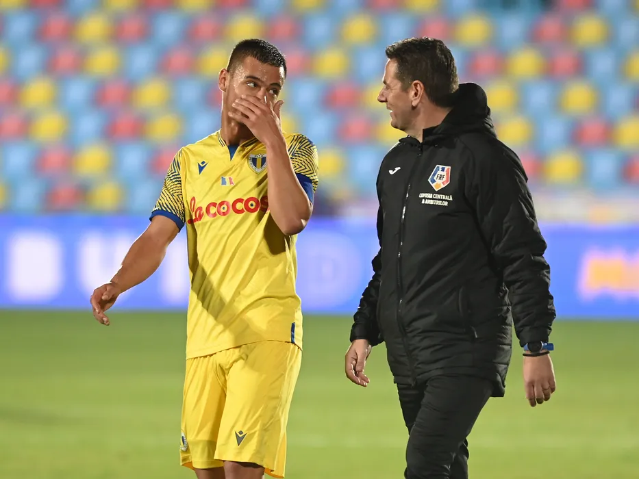 Valentin Constantin Ticu discuta cu arbitrul de rezerva Andrei Antonie la pauza meciului de fotbal dintre FC Voluntari si Petrolul Ploiesti, din cadrul Superligii Superbet, desfasurat pe Stadionul Anghel Iordanescu din Voluntari, vineri 1 decembrie 2023. © FOTO:Razvan Pasarica/SPORT PICTURES