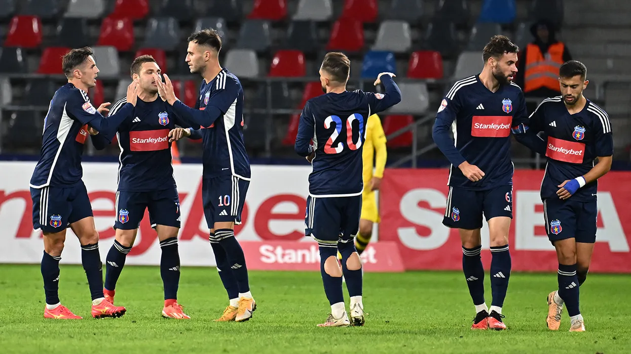 Fotbalistii stelisti Dean Beta, Adrian Popa, Remus Bogdan Chipirliu, Florin Rasdan, Daniel Virtej si Daniel Iglesias se bucura dupa un gol marcat in meciul de fotbal dintre Steaua Bucuresti si Concordia Chiajna, contand pentru Liga a-2-a Casa Pariurilor, desfasurat pe Stadionul Steaua-Ghencea din Bucuresti, joi 17 octombrie 2024. © FOTO:Razvan Pasarica/SPORT PICTURES