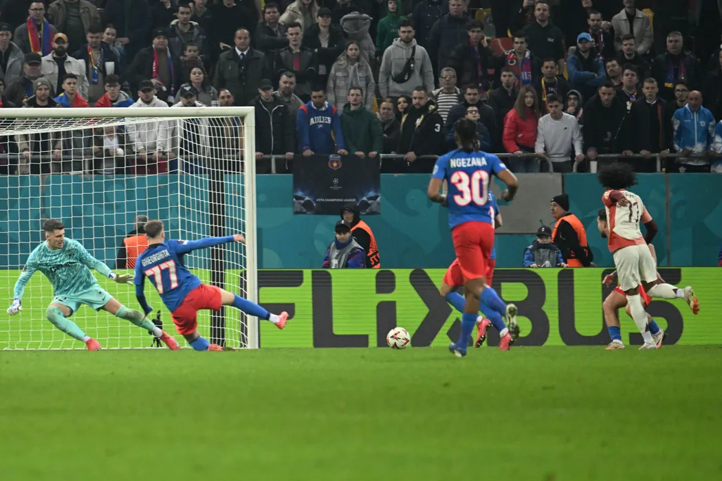 Malick Fofana marchează un gol in poarta lui Ștefan Târnovanu de lângă Andrei Cosmin Gheorghita si Alexandru Mihail Baluță in meciul de fotbal dintre FCSB si Olympique Lyon, din cadrul UEFA Europa League, desfasurat pe Arena Nationala din Bucuresti, joi 6 martie 2025. © FOTO:Razvan Pasarica/SPORT PICTURES