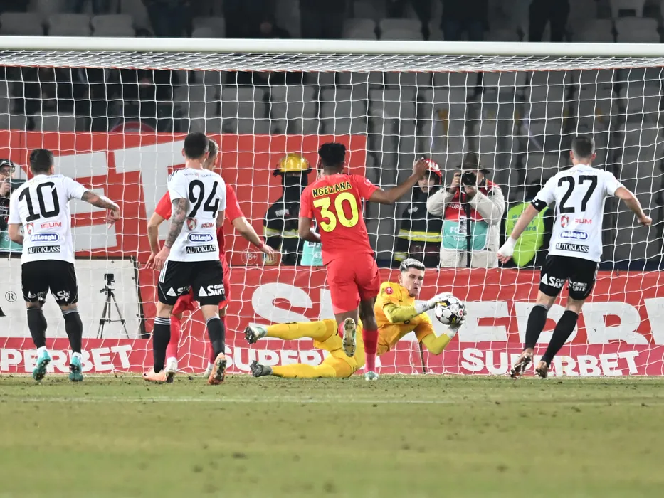 Ștefan Târnovanu apara un penalty executat de Dan Nicolae Nistor în meciul de fotbal dintre Universitatea Cluj si FCSB, contând pentru Superliga Superbet, desfășurat pe Cluj Arena din Cluj Napoca, luni 19 februarie 2024. © FOTO: Răzvan PĂSĂRICĂ/SPORT PICTURES