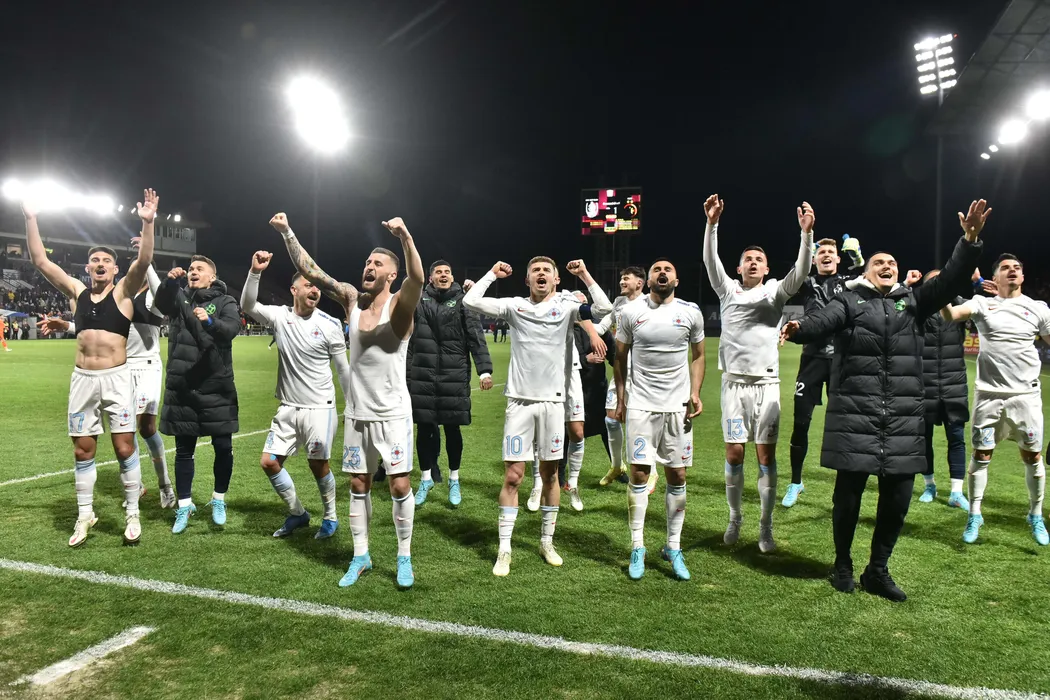 Bucurie a fotbalistilor stelisti Iulian Lucian Cristea, Andrei George Miron, Ovidiu Marian Popescu, Florin Lucian Tanase, Valentin Cretu, Ioan Andrei Vasile Dumiter, Adrian Gheorghe Sut si Valentin Gheorghe dupa meciul de fotbal dintre CFR Cluj si FCSB, contand pentru Play-off-ul Ligii 1 Casa Pariurilor, desfasurat pe Stadionul CFR Dr. Constantin Radulescu din Cluj Napoca, duminica 17 aprilie 2022. © FOTO:Razvan Pasarica/SPORT PICTURES