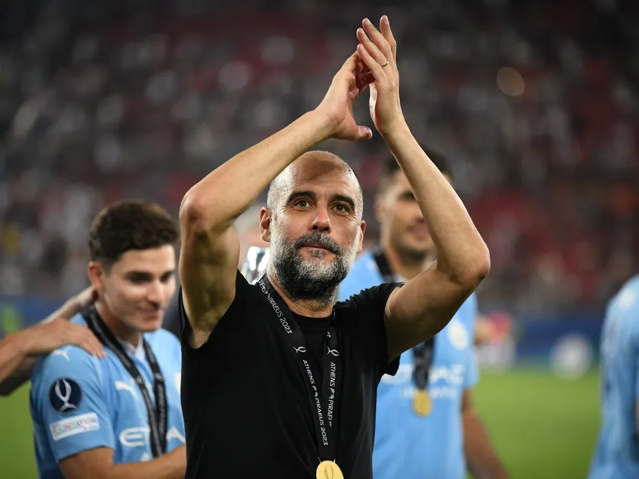 Josep Guardiola saluta tribuna dupa meciul de fotbal dintre Manchester City FC si Sevilla FC, contand pentru UEFA Europa Conference League, desfasurat pe Stadionul Georgios Karaiskakis din Atena, miercuri 16 august 2023. © FOTO:Tudi/SPORT PICTURES