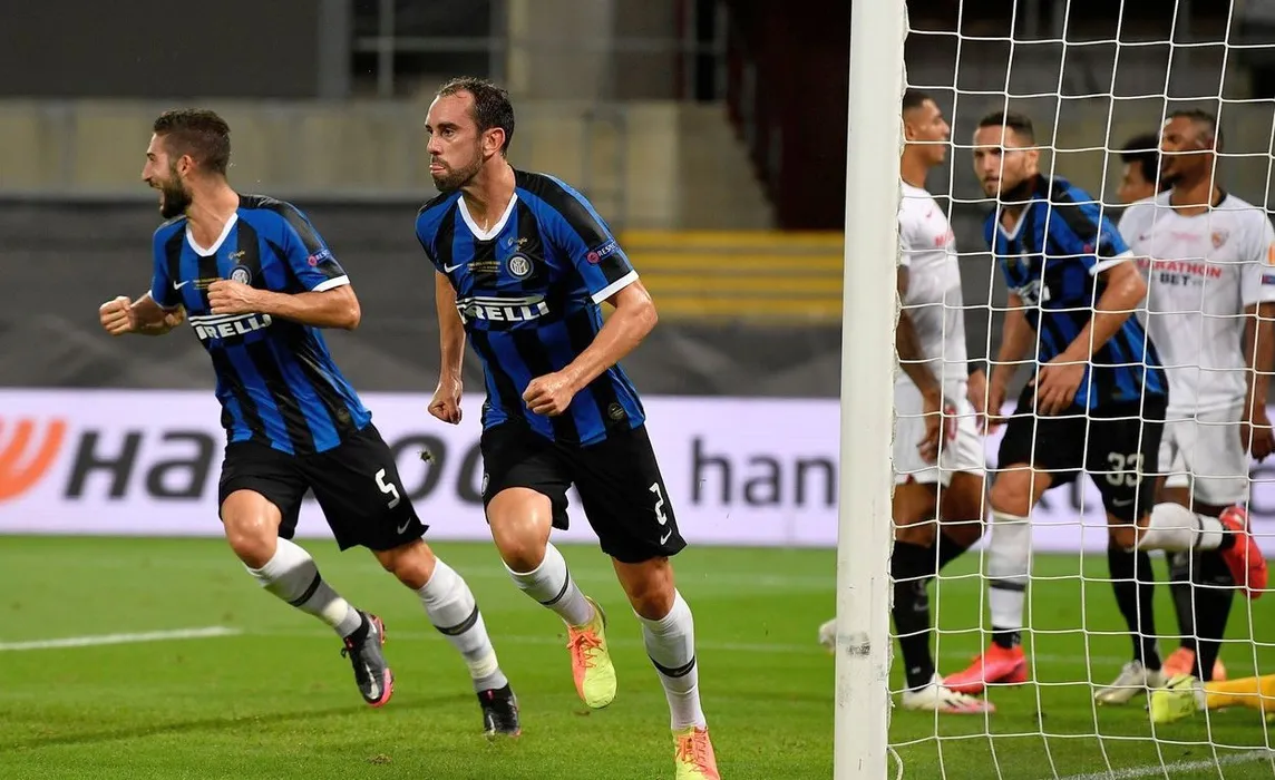 Diego Godin of FC Internazionale celebrates after scoring the goal