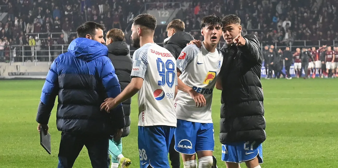 Fotbalistii constanteni Adrian Mazilu si Sebastian Andrei Borza se bucura dupa meciul de fotbal dintre Rapid Bucuresti si Farul Constanta, contand pentru Cupa Romaniei, desfasurat pe Stadionul Rapid Giulesti din Bucuresti, miercuri 9 noiembrie 2022. © FOTO:Razvan Pasarica/SPORT PICTURES