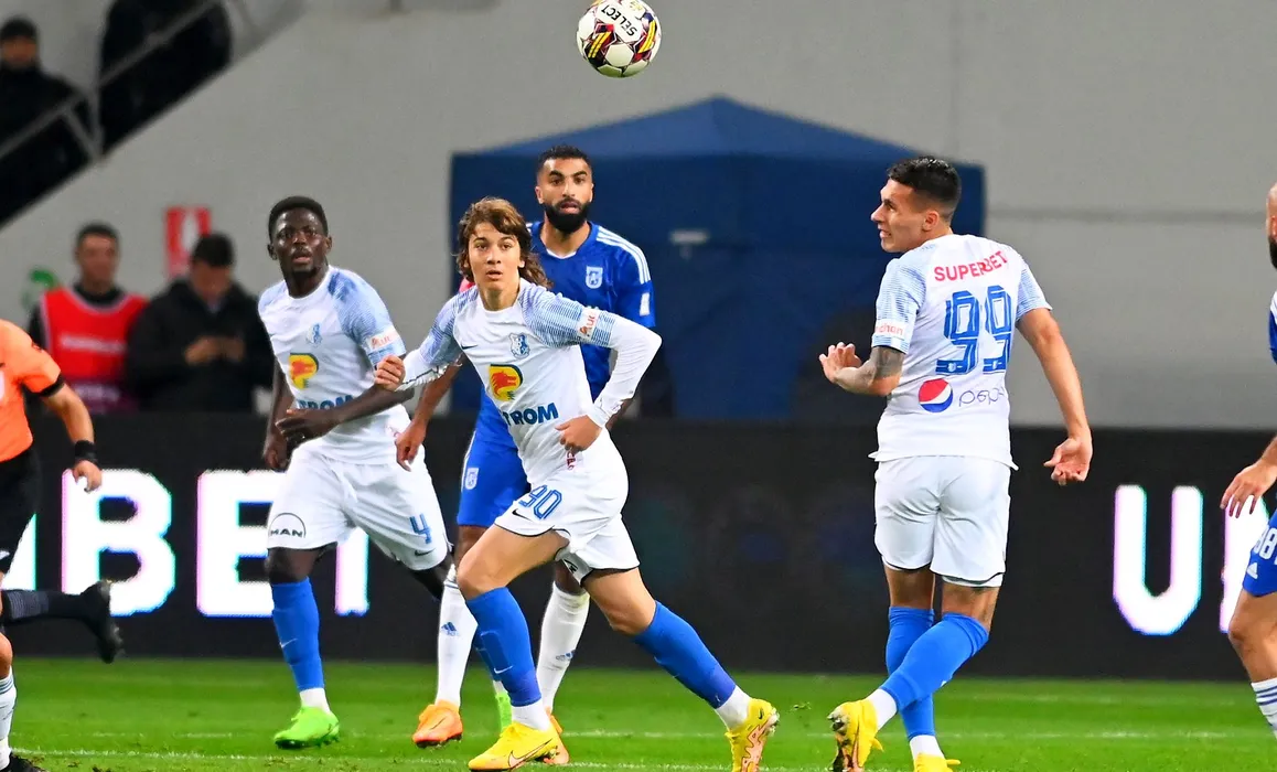Kevin Doukoure Grobry, Alexandru Constantin Stoian si Robert Marian Moldoveanu in meciul de fotbal dintre FC U Craiova si Farul Constanta, contand pentru Superliga Superbet, desfasurat pe Stadionul Ion Oblemenco din Craiova, vineri 28 octombrie 2022. © FOTO:Razvan Pasarica/SPORT PICTURES