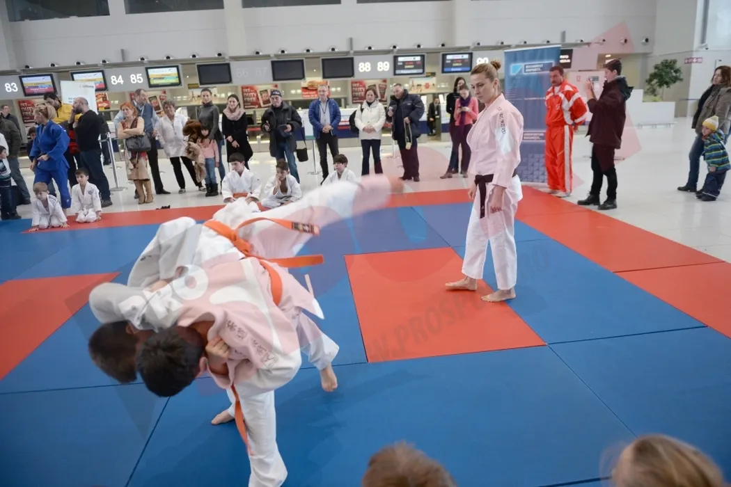 FOTO: Alina Dumitru, demonstrație de judo în aeroport. Jucătorii de la ACS Poli, spectatori de lux