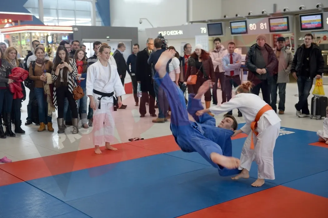 FOTO: Alina Dumitru, demonstrație de judo în aeroport. Jucătorii de la ACS Poli, spectatori de lux