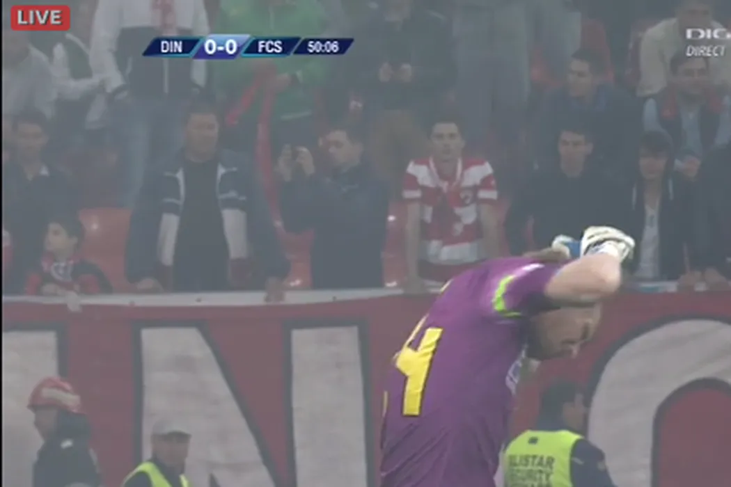 FOTO | Atacat cu torțe de galeria dinamovistă, Arlauskis a ieșit de pe teren. Cristi Balaj a întrerupt derby-ul pentru mai bine de 15 minute
