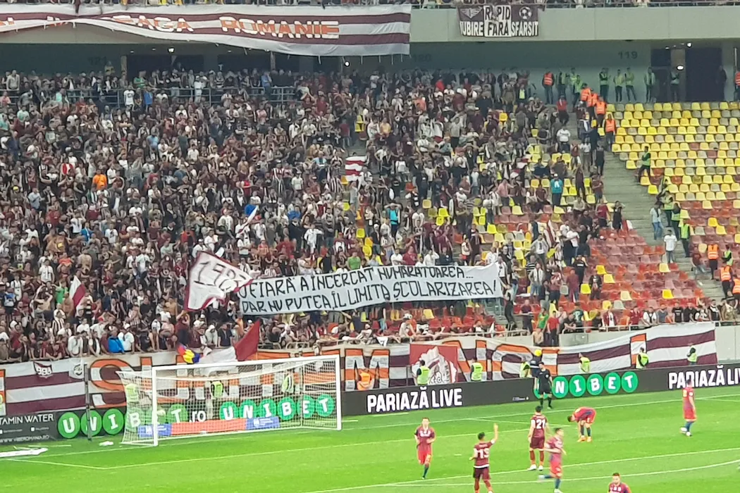 FOTO | Cum se pot contra două galerii și fără să împartă pumni: ironii, contra-mesaje și cinstirea gloriilor. Toate bannerele afișate de suporteri în timpul meciului Steaua – Academia Rapid