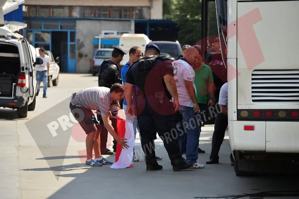 FOTO EXCLUSIV: O parte dintre fanii Legiei, opriți de jandarmi la intrarea în București! 13 suporteri polonezi au fost reținuți și duși la secție