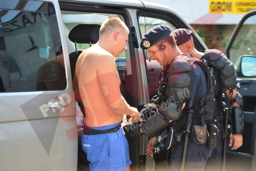 FOTO EXCLUSIV: O parte dintre fanii Legiei, opriți de jandarmi la intrarea în București! 13 suporteri polonezi au fost reținuți și duși la secție