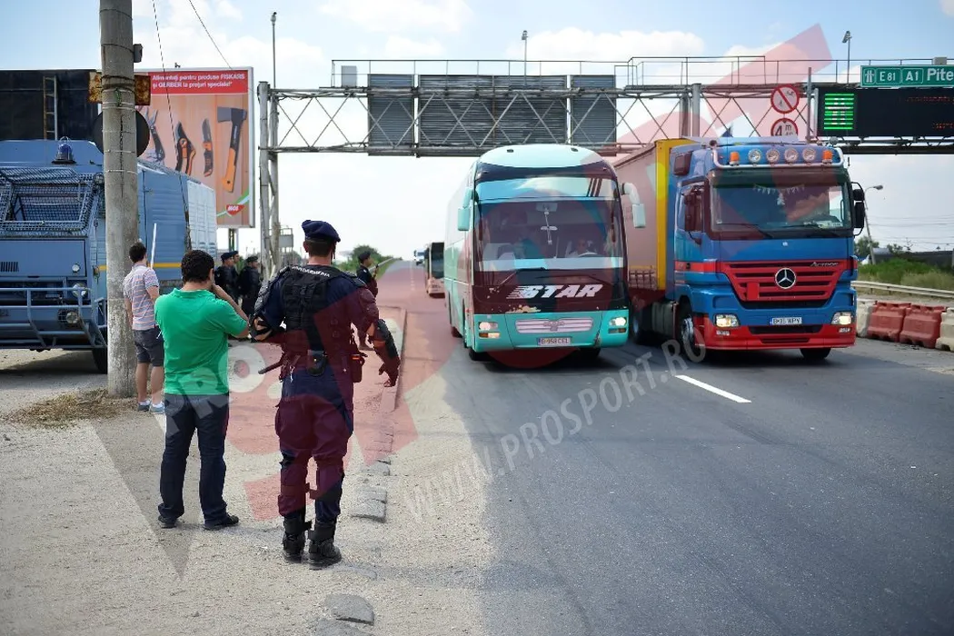 FOTO EXCLUSIV: O parte dintre fanii Legiei, opriți de jandarmi la intrarea în București! 13 suporteri polonezi au fost reținuți și duși la secție
